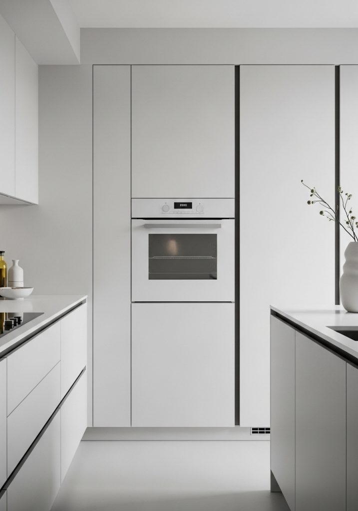 Monochromatic kitchens can be sleek, but to add warmth, depth, and visual interest, mixing materials and textures is where the magic happens. Think beyond just one type of cabinet finish. Combine sleek, high-gloss cabinets with a rough, textured wood island. Pair cool, smooth quartz countertops with a raw concrete backsplash. Introduce metallics, glass, or even woven elements through lighting fixtures or bar stools.