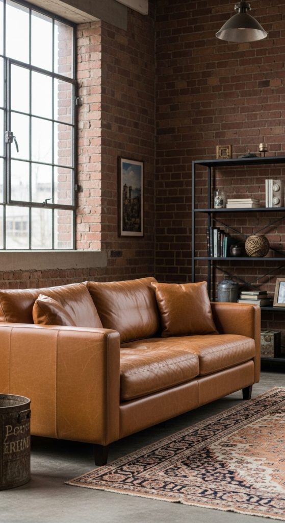 - Pro tip: Balance the rich caramel hue with light linen throw pillows to dodge the “man cave” stereotype.