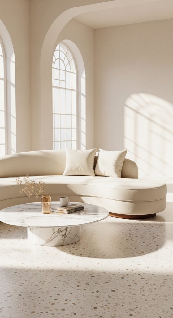 - Conversation starter: Center a round coffee table to echo the curve for cohesive style.