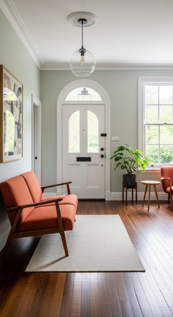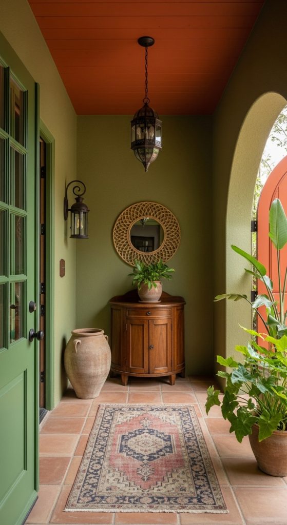 Make a memorable first impression with an entryway that glows with terracotta and sage green hues. Paint the walls in a soft sage to create an instantly welcoming feel. Greet guests with warmth by incorporating a terracotta-colored element, like a decorative urn with greenery, a patterned runner, or a piece of abstract art. A simple wooden bench with sage green cushions offers a practical spot to remove shoes while adding to the cozy aesthetic. For functionality, install natural wood wall hooks for coats and bags, which add a rustic touch without compromising style.