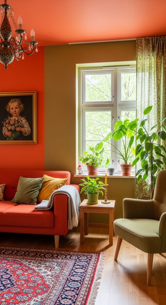 Make your living room pop with a bold feature wall. Paint one prominent wall in a rich, warm terracotta to create an energizing and inviting backdrop, while keeping the remaining walls in a soft, complementary sage green. This dynamic contrast can be beautifully enhanced with decor that ties the two colors together. A sage green throw blanket draped over a neutral sofa, along with cushions that feature patterns of both terracotta and sage, will unify the theme and create a cohesive, designer look.