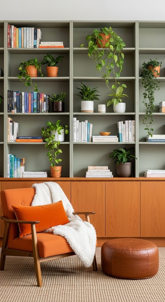 Fashion a tranquil reading nook or home library with sage green walls and terracotta-colored bookshelves. This soothing color scheme cultivates a peaceful environment, perfect for getting lost in a good book. Add a comfortable armchair with sage green cushions to create an inviting seat. Dot the shelves with small terracotta planters to bring a touch of life and nature into the room. Soft, focused lighting, like a stylish floor lamp, will create a cozy ambiance, making your reading corner the perfect retreat for relaxation.