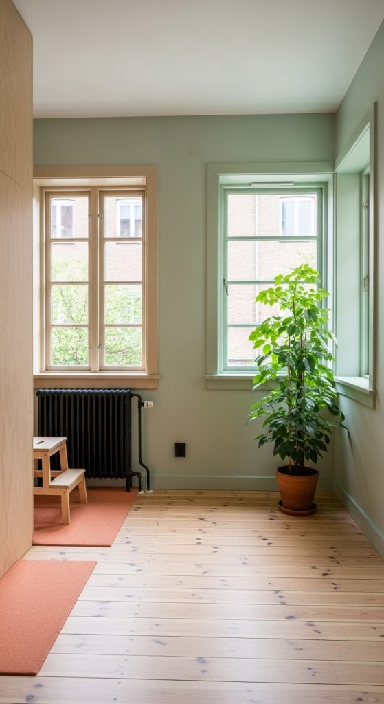 Transform a purely functional hallway into a warm and inviting passage. Paint the walls in a soothing sage green to create a peaceful journey from one room to the next. Add visual interest and a pop of color with a terracotta-colored runner rug. Soft lighting from wall sconces is crucial for enhancing the warmth of the colors. For a touch of style and function, hang a mirror with a thin terracotta or natural wood frame to open up the space and reflect the earthy tones.