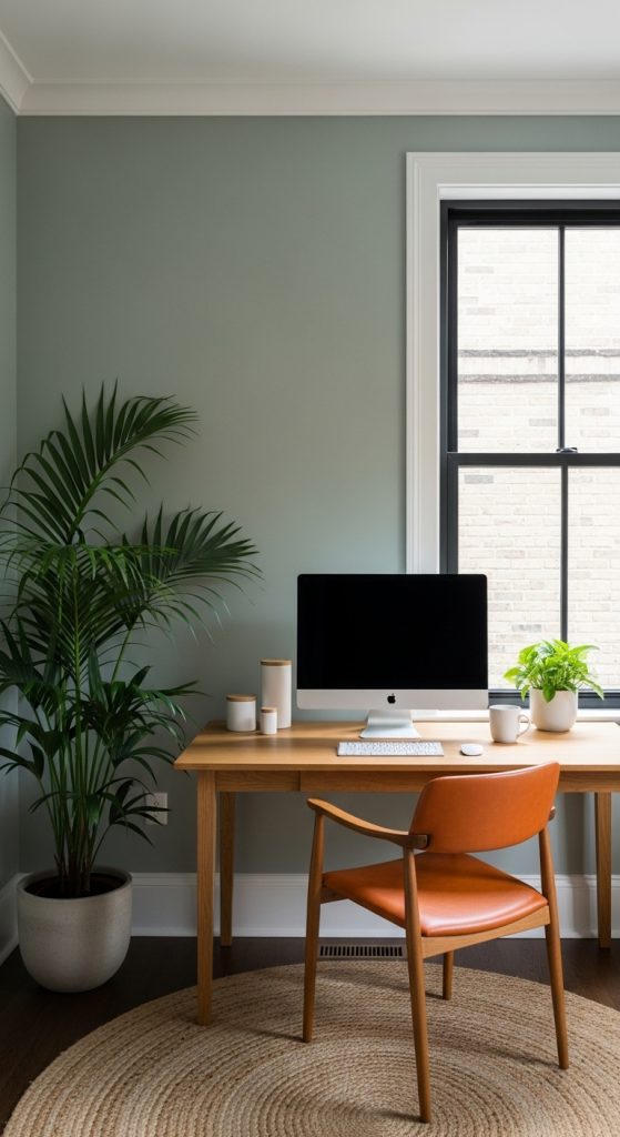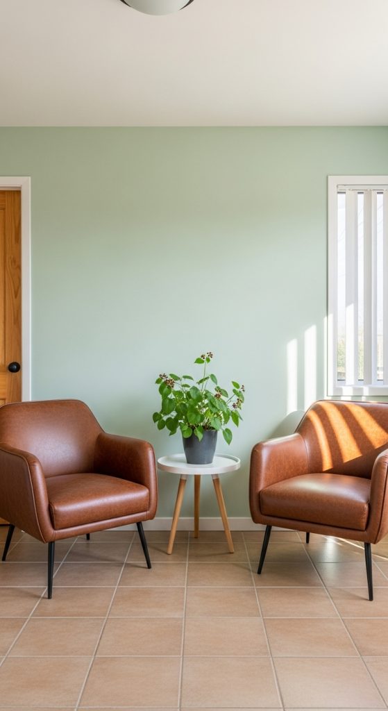 Design a client-facing consultation area or office space that feels both professional and calming. Start with sage green walls to create a welcoming, non-intimidating atmosphere. Incorporate comfortable guest chairs upholstered in a durable terracotta fabric to add a touch of warmth and style. A large piece of abstract art that pulls in both colors can serve as a sophisticated focal point. Keep the rest of the decor minimal and allow for plenty of natural light to keep the space feeling bright, open, and conducive to clear communication.