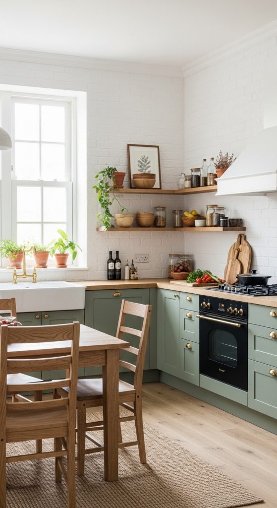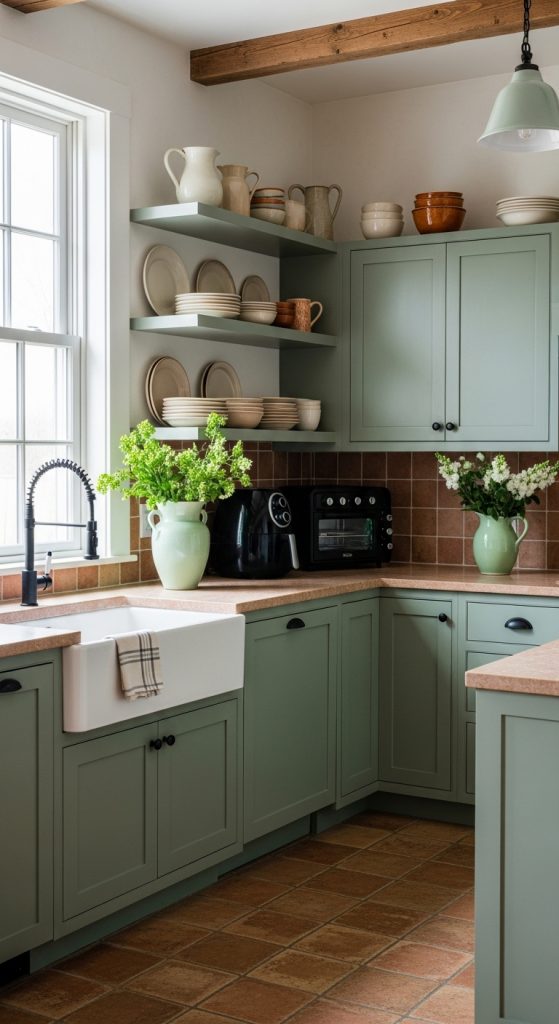 Transform your kitchen into a culinary sanctuary by pairing gentle sage green cabinetry with the rustic charm of terracotta floor or backsplash tiles. This combination of materials is not only visually stunning but also evokes a feeling of timeless, earthy comfort. Enhance the design by choosing appliances in a matching sage green for a seamless, cohesive aesthetic that makes your cooking space feel exceptionally inviting. Open shelving is a perfect way to display beautiful terracotta dishware, blending functionality with decorative charm. A rustic wood dining table can complete the look, creating a warm and welcoming hub for family meals.