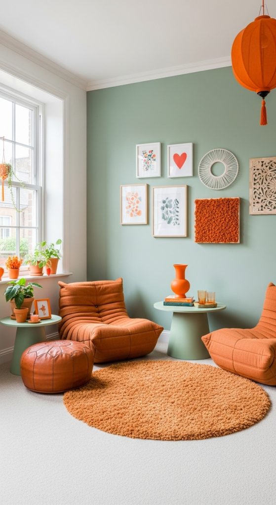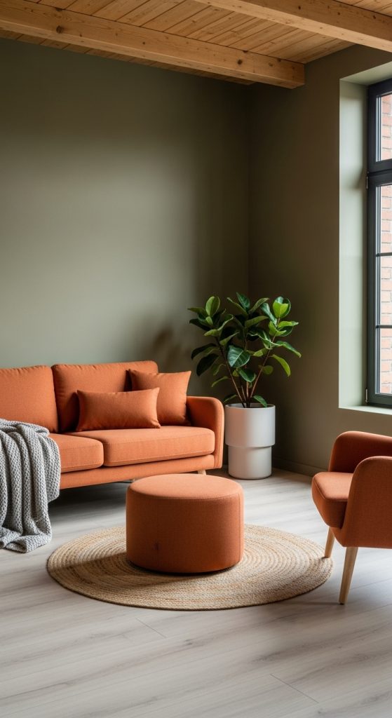 Create a lounge area that practically begs you to unwind with sage green walls and plush terracotta furniture. A deep, comfortable sofa or a set of armchairs in a rich terracotta velvet or linen will serve as the perfect centerpiece. Layer your seating with pillows and throws that feature a mix of earthy textures in both colors. A low-slung coffee table in a dark wood will ground the space. Finally, incorporate soft, dimmable lighting to create an intimate and inviting evening atmosphere perfect for conversation or quiet relaxation.