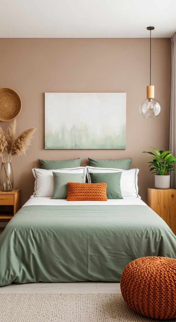 21 Earth Tone Palettes for a Warm and Elegant InteriorEnvision your walls painted in a tranquil shade of sage green, creating a calm and expansive backdrop. This cool, muted tone is the perfect canvas to make terracotta accents truly stand out. Introduce the rustic warmth of terracotta through carefully chosen pieces like sculptural vases, planters, or lamp bases. The contrast between the cool green and the warm, fiery clay creates a visual harmony that is both dynamic and deeply grounding. To maintain an open and uncluttered feel, practice a minimalist approach to decor, allowing each piece to have its own space to breathe.