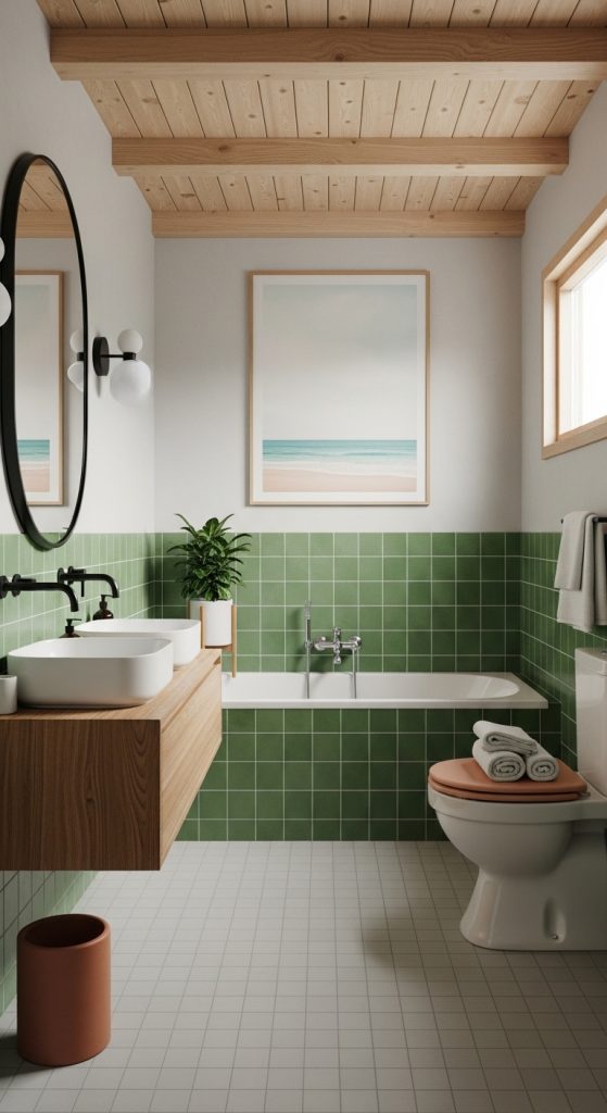 Turn your bathroom into a spa-like escape with serene sage green walls and thoughtfully placed terracotta accessories. Consider using sage green tiles in the shower or as a wainscoting detail to set a calming tone. Enhance the natural vibe by placing small succulents or herbs in terracotta planters on shelves or by the sink. Natural wood, used for the vanity or shelving, elegantly ties the two colors together. For a touch of luxury, opt for plush bath towels in a deep sage green. The finishing touch? Terracotta candle holders to cast a warm, flickering light for a truly relaxing bath experience.