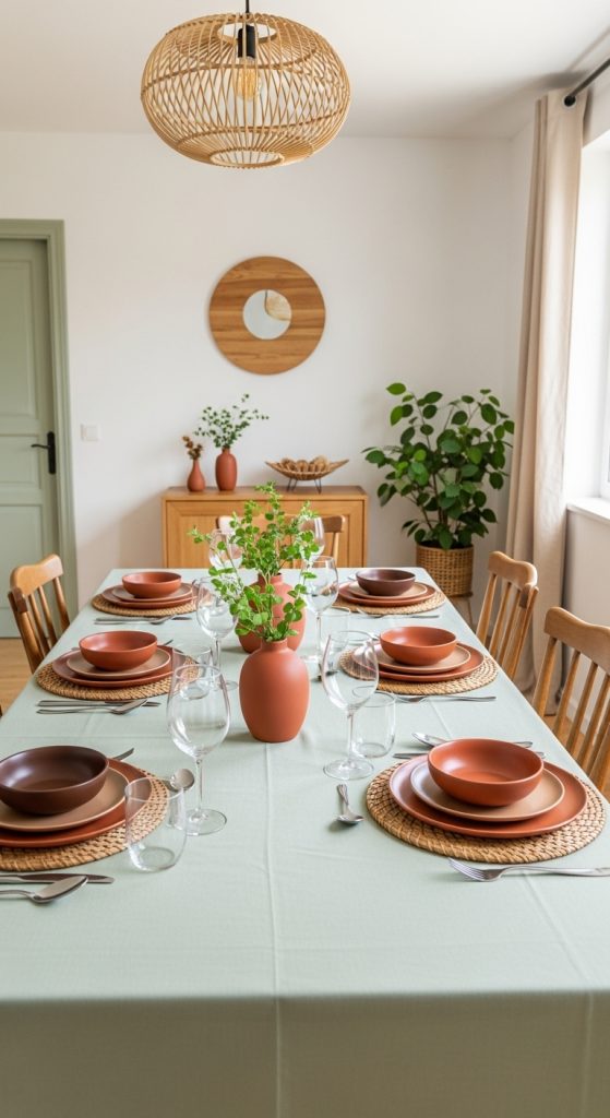 31 Wooden Decor Ideas for a Flawless Nordic Living RoomElevate your dining experience in a modern setting that artfully showcases terracotta and sage green. Start with a sage green tablecloth or runner as a fresh and inviting base. This will harmonize beautifully with terracotta-colored dinnerware or charger plates. Incorporate sleek wooden furniture to keep the look grounded and contemporary. Use terracotta candle holders with tall, elegant tapers as a simple yet dramatic centerpiece. To complete the cohesive look, use cloth napkins in a matching sage green. Finally, a vase of fresh, seasonal flowers will bring life and natural beauty to the table.