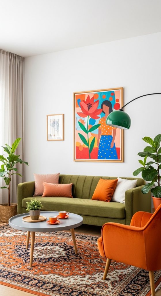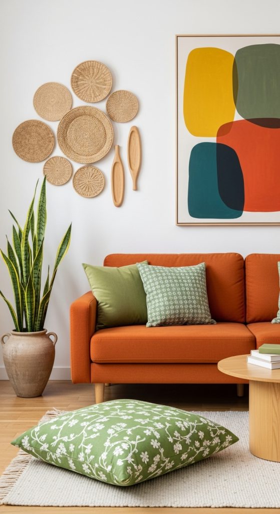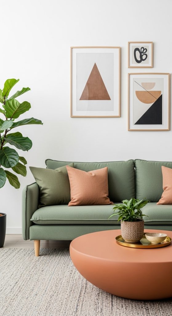 Let your living room become a gallery for your creative spirit, using terracotta and sage green as the backdrop for bold artistic choices. Start with a significant piece of furniture that makes a statement, like a uniquely shaped sofa in a rich terracotta hue. This serves as a warm and inviting anchor for the entire space.