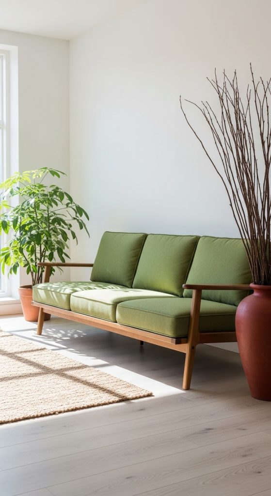 Design a living room that is both stylish and ready for the rigors of family life by using terracotta and sage green in a practical way. Choose durable, easy-to-clean fabrics for your main furniture. A sofa with a washable slipcover in a forgiving sage green color is a smart and chic choice, protecting your investment from spills and stains.