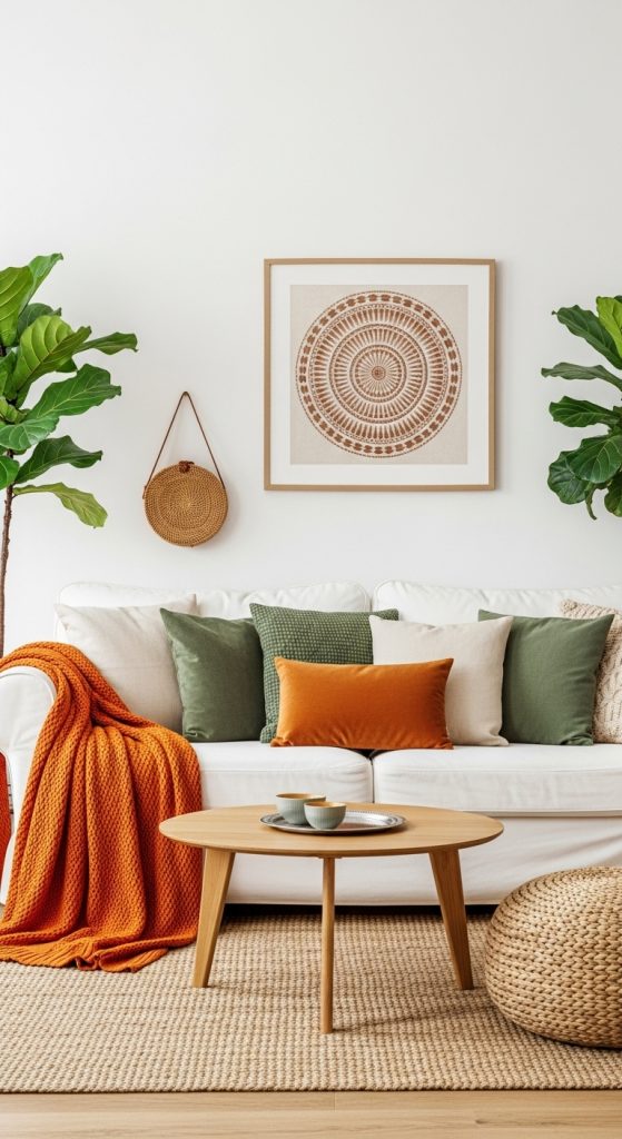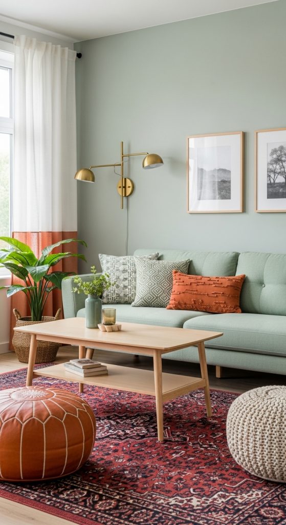 Design a bohemian-inspired living area where earthy terracotta and cool sage green can truly flourish. This style is all about texture, pattern, and a relaxed, unconventional spirit. Start by layering different rugs, perhaps a Moroccan-style area rug with a vintage pattern to provide a neutral yet interesting base for your decor.