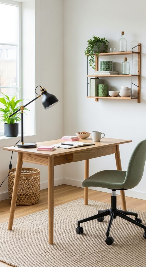 Use stylish terracotta-colored organizers, like pen holders and file boxes, to keep your desk tidy and add a warm, earthy accent. Introduce a small plant or two to bring a touch of nature to your work area, which can help reduce stress and boost creativity. By integrating the workspace with the living room's overall color scheme, you create a cohesive look that is both highly functional and aesthetically pleasing.