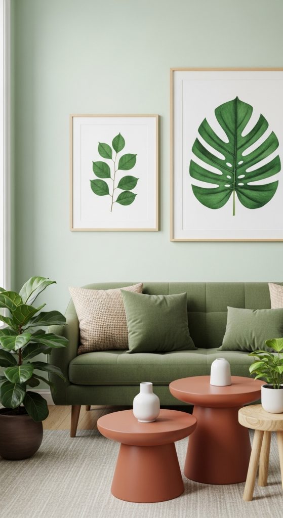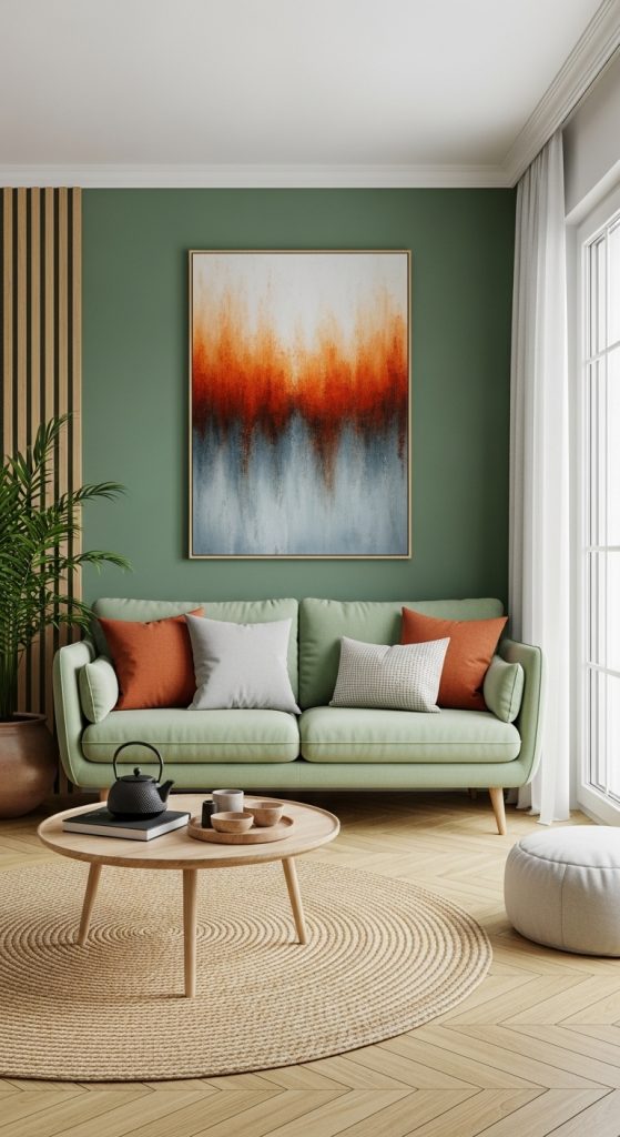 Step into a space where the gentle, muted tones of sage green provide a soothing backdrop, reminiscent of a misty morning forest. This coolness is perfectly balanced by the rich, sun-baked warmth of terracotta, grounding the room with a feeling of stability and comfort. When brought together, these two colors can elevate any living room from a simple common area to a personal retreat designed for relaxation and elegant entertaining.