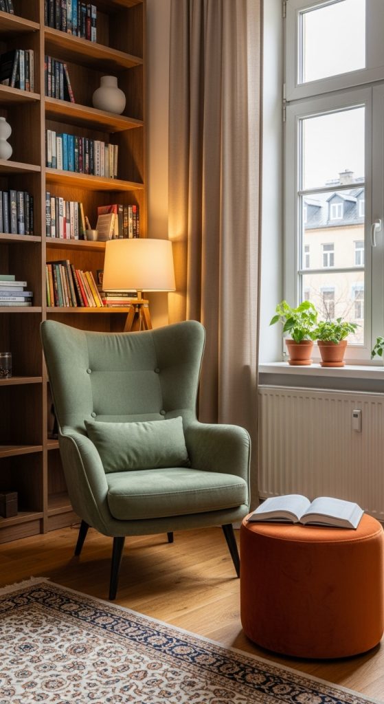 Create the ultimate cozy reading nook in a corner of your living room using the comforting duo of terracotta and sage green. Start with a plush, deep-seated armchair in a soft sage green fabric that you can truly sink into. Pair it with a versatile terracotta-colored ottoman, which serves as a comfortable footrest and can offer hidden storage for books or a warm blanket.