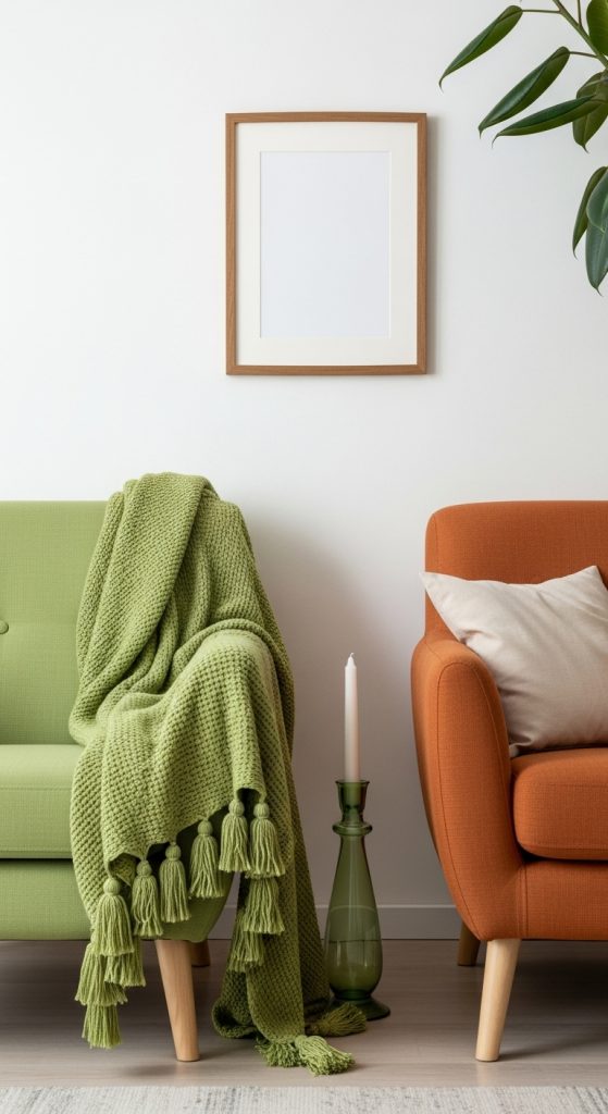 A living room decorated in earthy terracotta and calming sage green provides a perfect, versatile base for seasonal updates. This timeless palette can be easily adapted throughout the year. Use removable cushion covers on your pillows, allowing you to switch from a light linen in the summer to a cozy wool or velvet in the winter, all while staying within your color scheme.