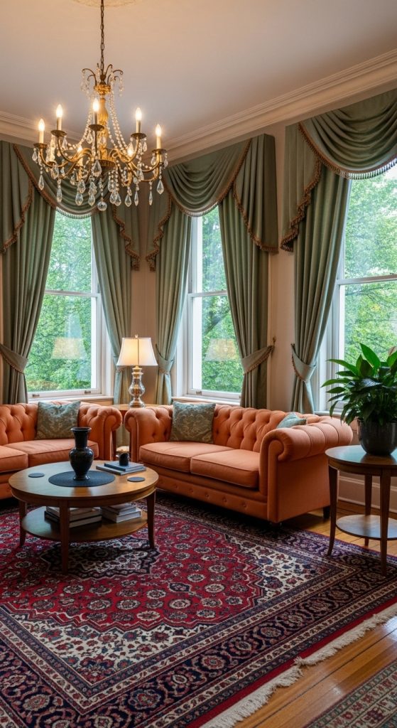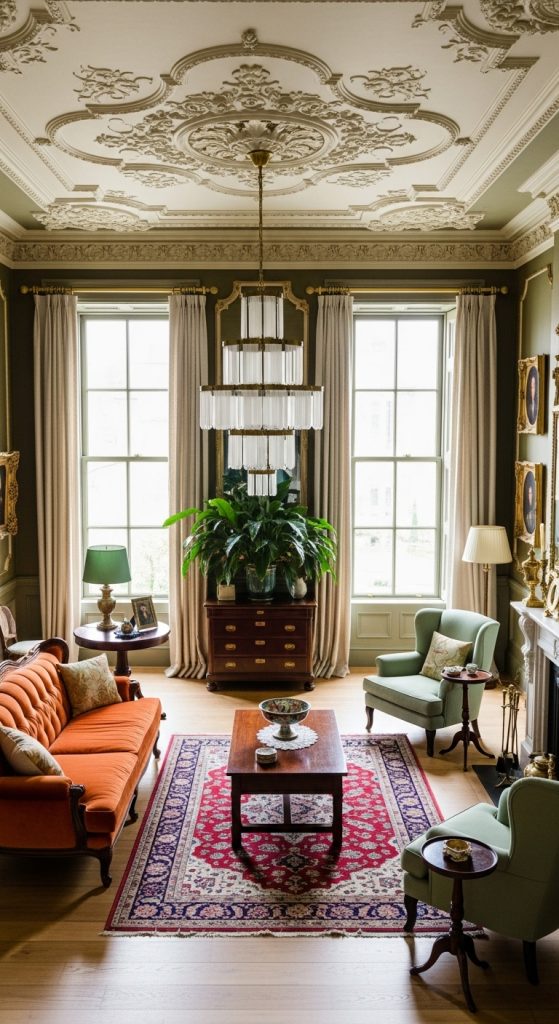 Complement the sofa with a pair of sage green armchairs, perhaps with elegant curved legs or button-tufted details. To tie the colors together, introduce a floral-patterned area rug that incorporates shades of both terracotta and green, adding visual interest and softness underfoot. Complete the look with antique-inspired elements like an ornate gold-framed mirror or a classic chandelier. This style is all about creating a space with history and heart.
