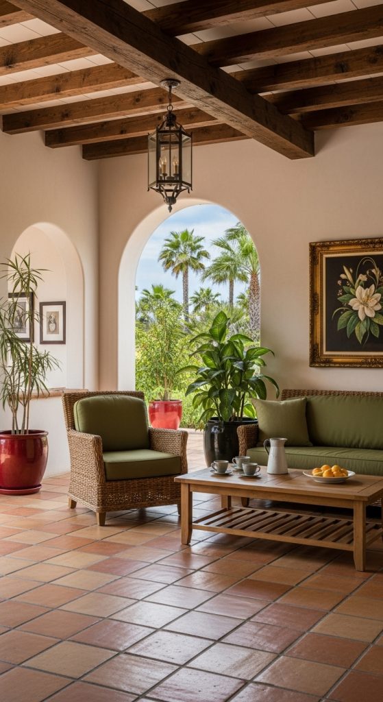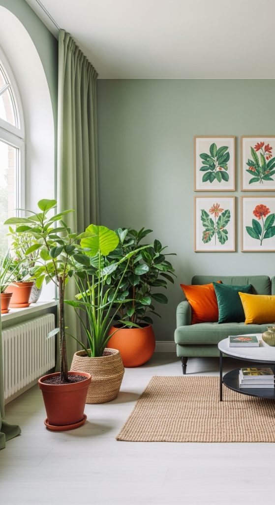Transform your living room into a private tropical oasis with a dynamic mix of sage green and earthy terracotta. The key to this style is to embrace the lushness of nature. Introduce large, leafy plants like monsteras or fiddle-leaf figs, housed in oversized terracotta planters to make a dramatic statement and bring the outdoors in.