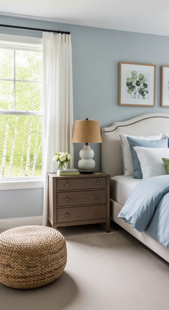 In bedrooms, muted blues have a particularly calming effect, making them perfect for unwinding at the end of a long day. Pair them with a beige or taupe area rug to ground the design while adding essential warmth and texture. To keep the space from feeling too static, introduce playful patterns in your decor. This palette is ideal for creating restful retreats that invite you to relax, recharge, and find your center.