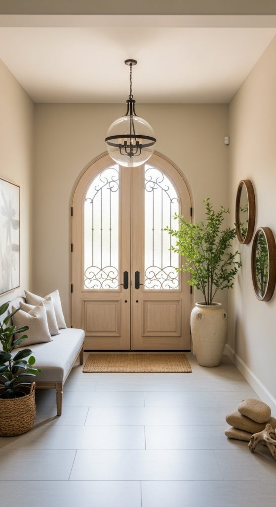 Use this palette in an entryway to create a welcoming first impression. A beautiful jute area rug can anchor the space, adding rustic charm while complementing the sandy tones. Pairing these light colors with dark wood furniture will create a grounded contrast that elevates the overall aesthetic.