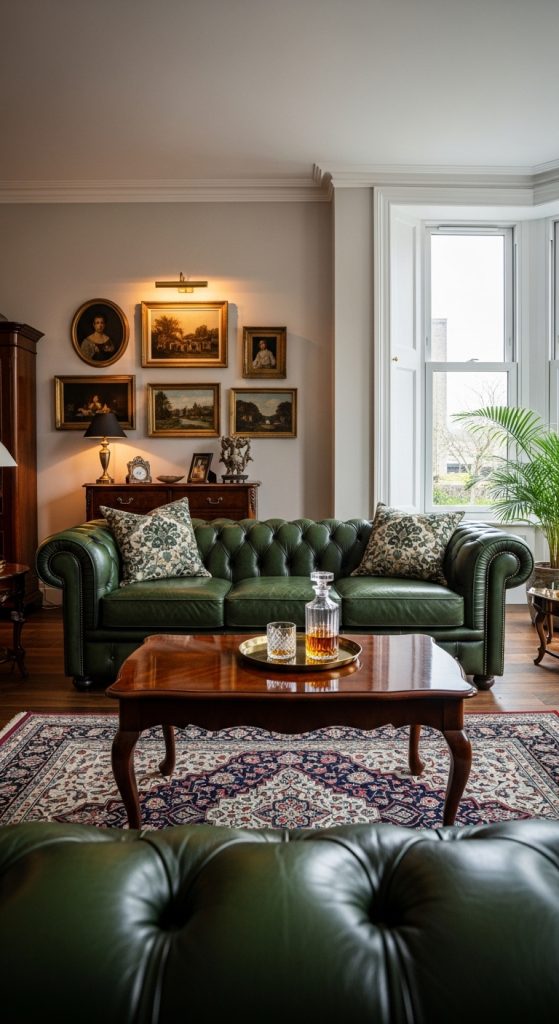 I once saw a dark green leather Chesterfield in a loft apartment and honestly, I still dream about it. It’s that powerful. Go for rich browns, bottle greens, or navy blues to really channel that "old money" aesthetic.