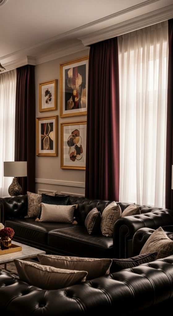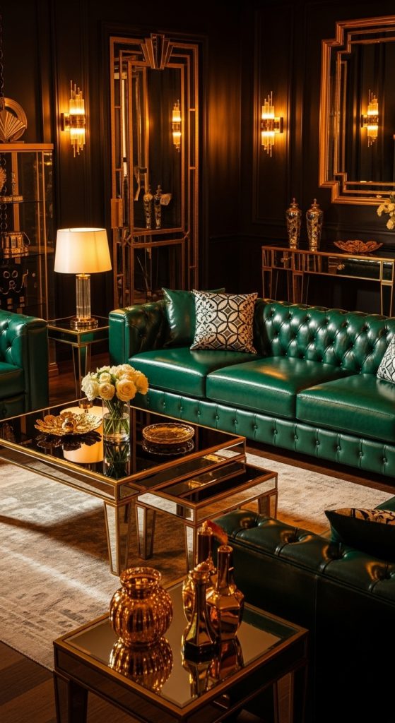 Want your living room to feel like a Gatsby party? Go for Art Deco leather sofas with gold accents, glossy finishes, and dramatic shapes.