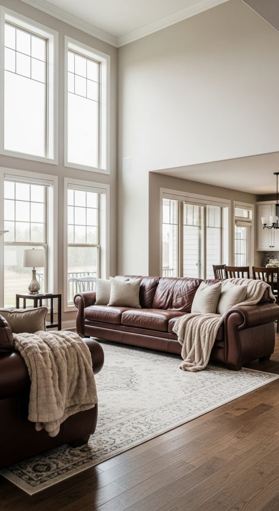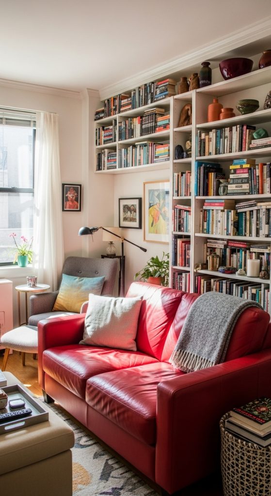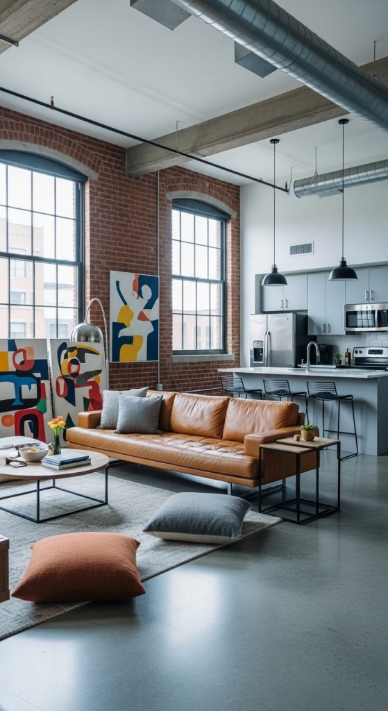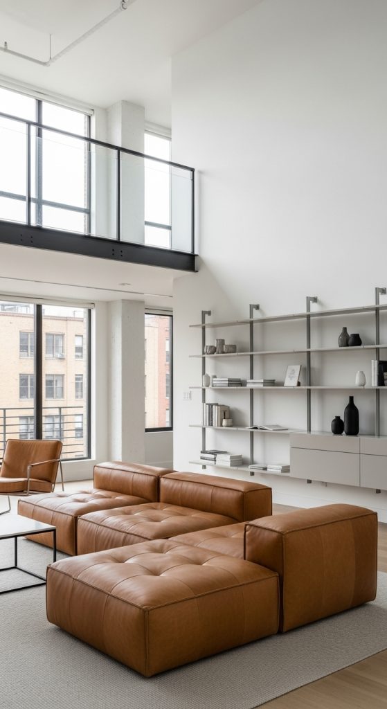 For that sleek, designer loft vibe, go for a low-profile leather sofa. They’re modern, minimalist, and make your space feel way bigger than it is.