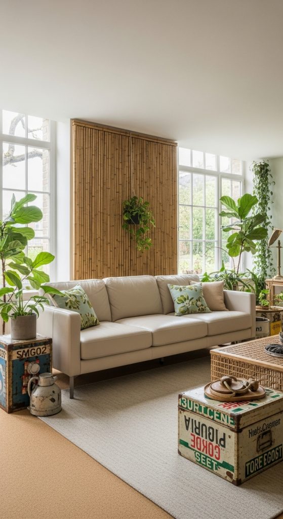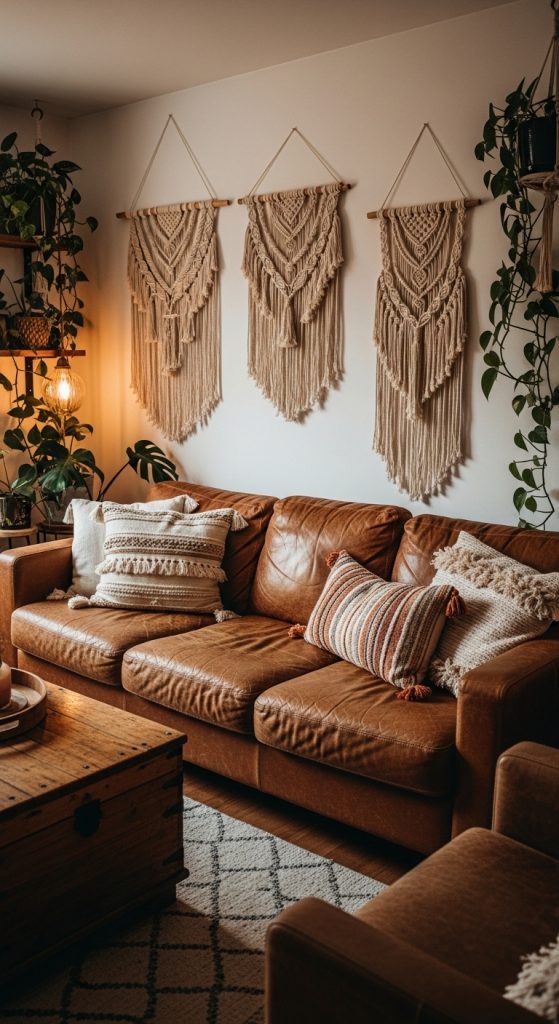 Who says leather can’t be boho? Pair a worn-in leather couch with woven pillows, macrame throws, and plants everywhere.