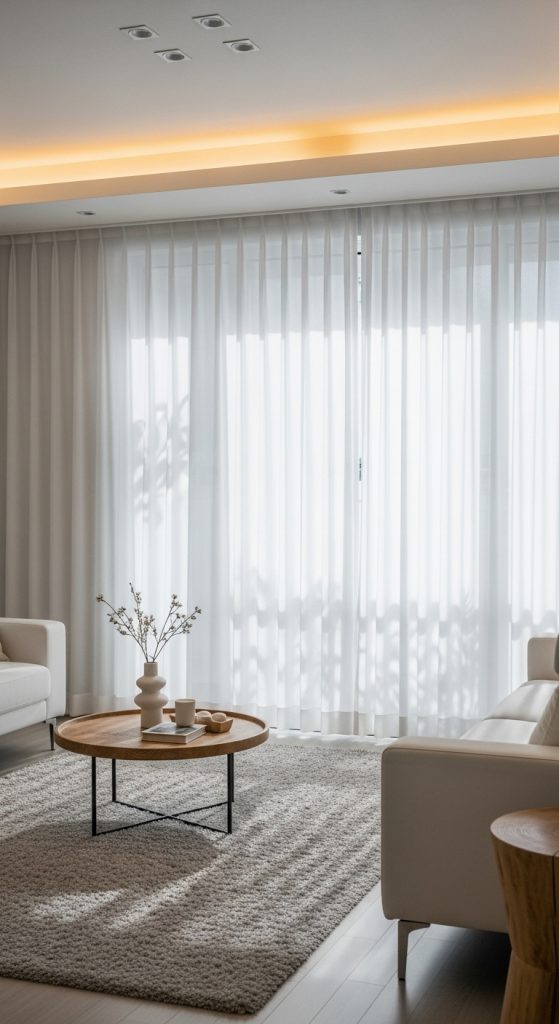 - Why it works: White sheer curtains add brightness without stealing the spotlight.
