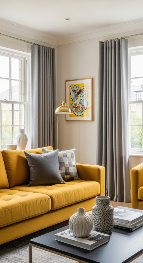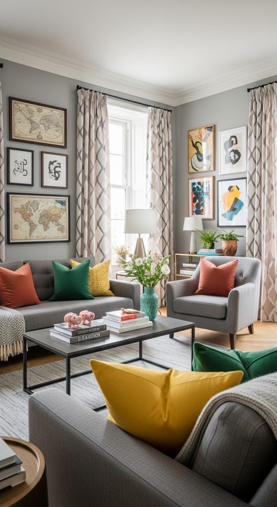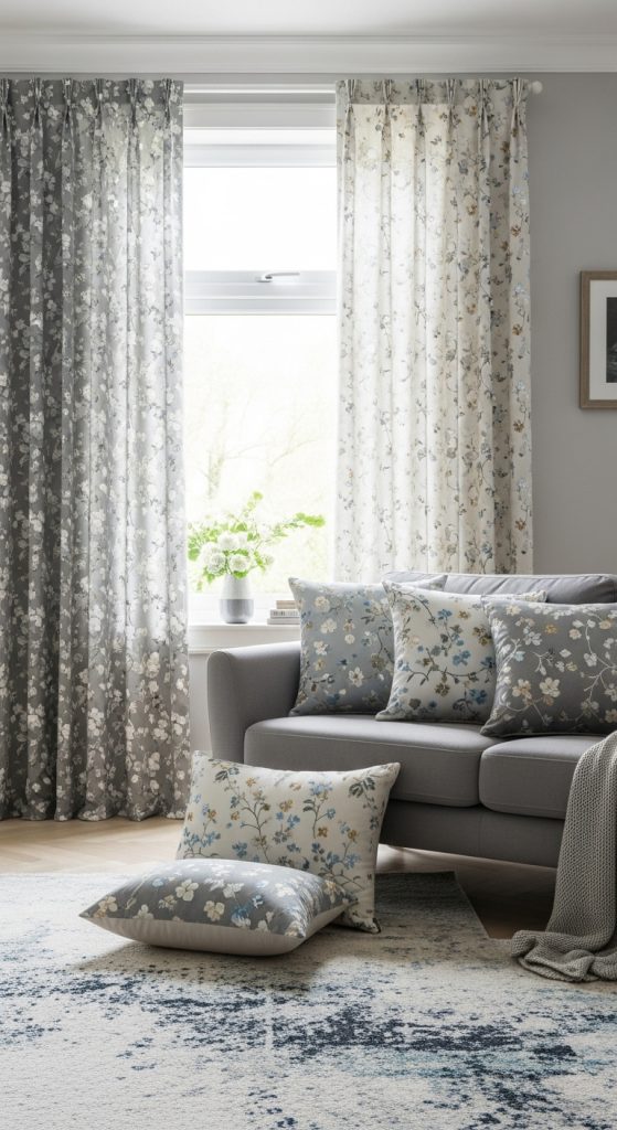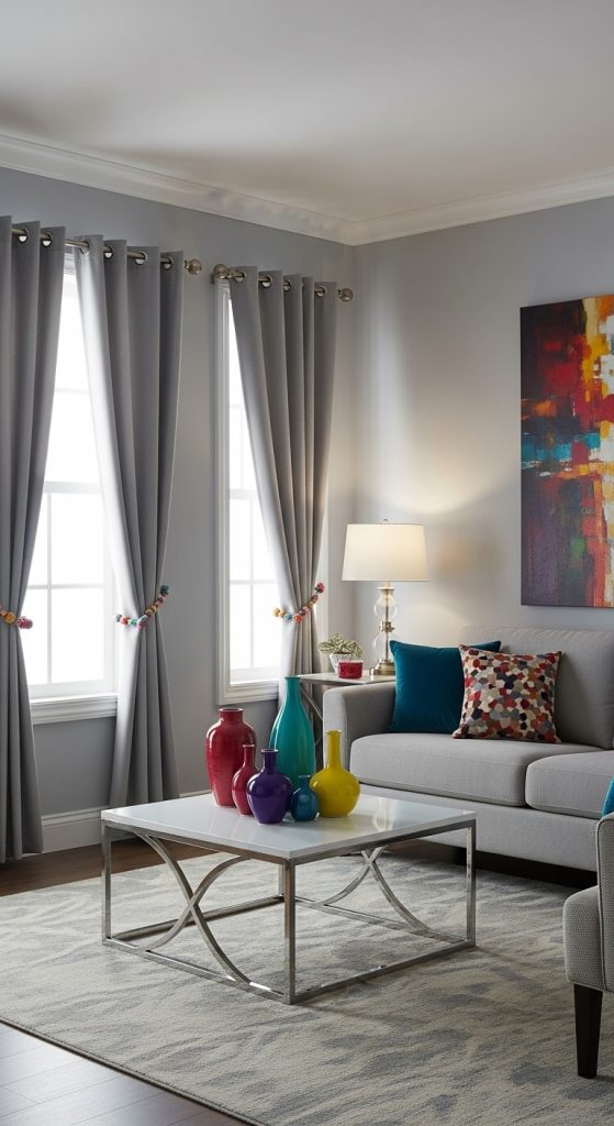 20 Gray Living room Ideas with a Pop of Color to Liven Up Your Space22. Match Curtains with Throw Pillows (But Not Too Much)