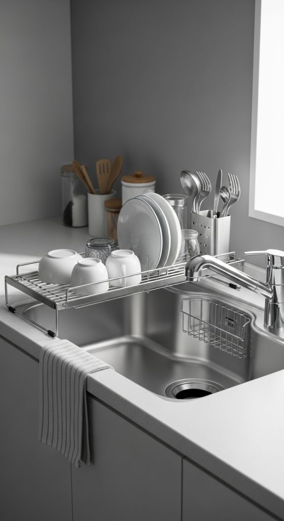 13 Store Hacks for Small Kitchen Organization13. Compact Sink + Drying Rack Combo