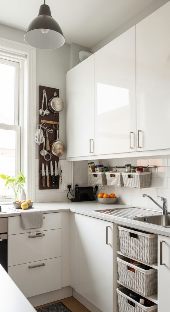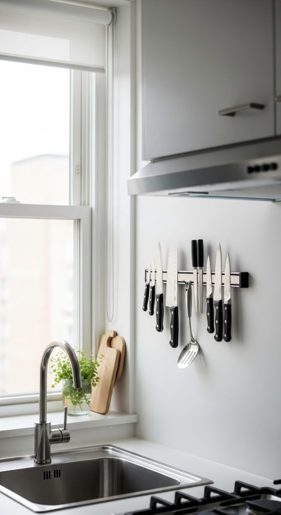 Use tall cabinets, hang baskets from the ceiling, or install a magnetic knife strip on the wall.