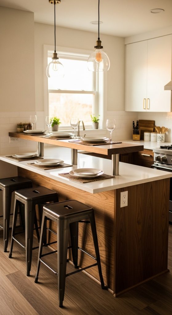 Some DIY wizards build raised bar-style ledges over a portion of their counter. It separates prep from serve and adds a second surface without needing more space.