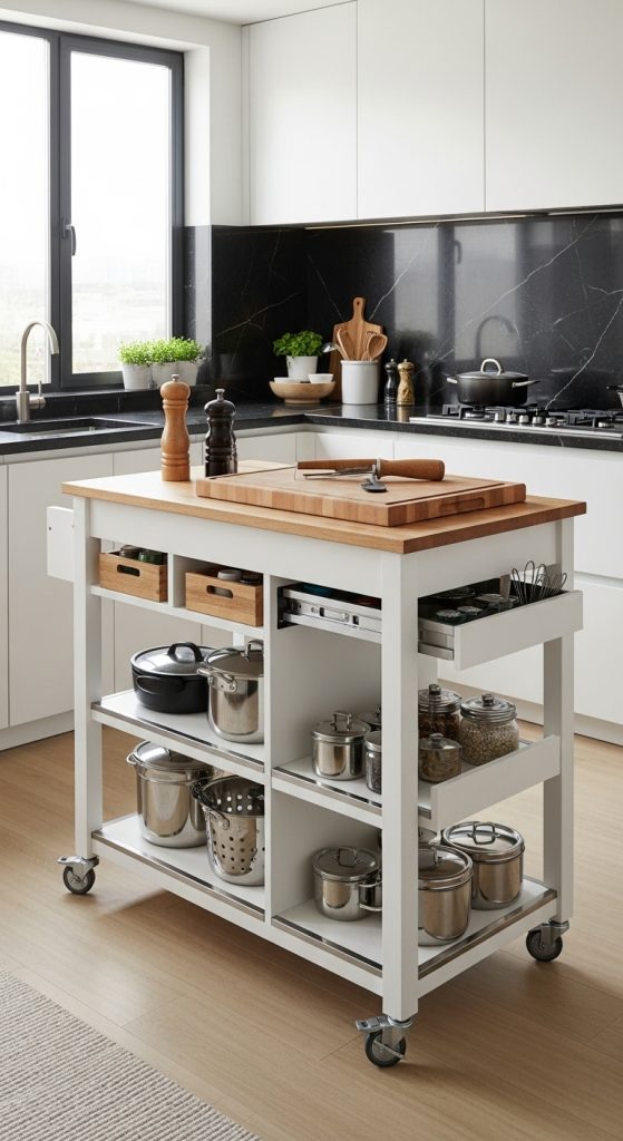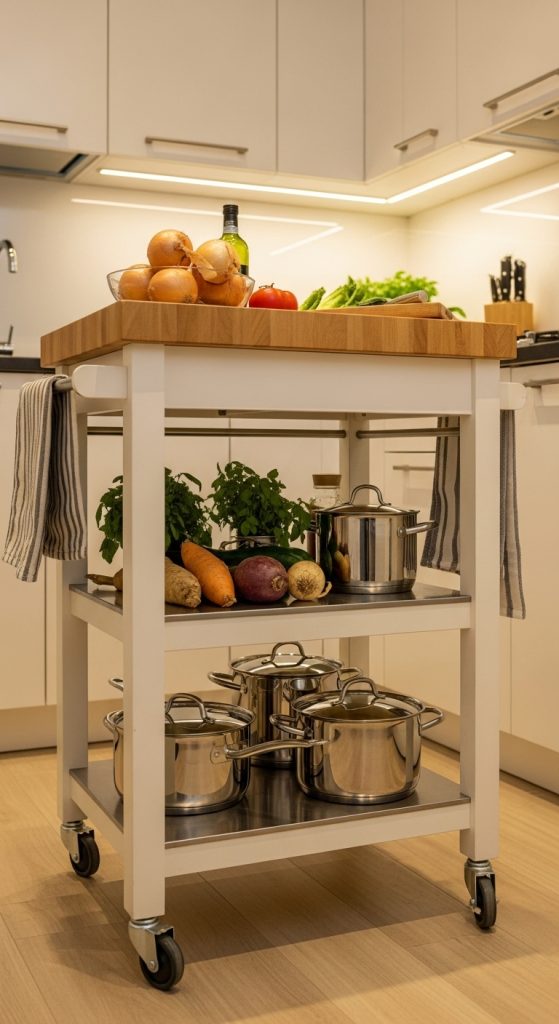 A wheeled cart is already cool. But you can add caster wheels to cutting boards, cabinets, even small trash bins.