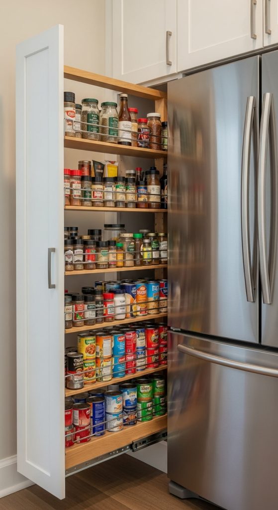 21 Brilliant Small Kitchen Organization Ideas You’ll Wish You Knew SoonerPull-out pantries are magical little things. They hold spices, snacks, and cans in a super narrow space, and they slide out like a drawer from Narnia.