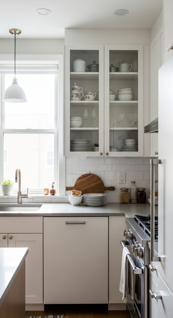 Here's a little trick: glass-front cabinets give the illusion of depth.