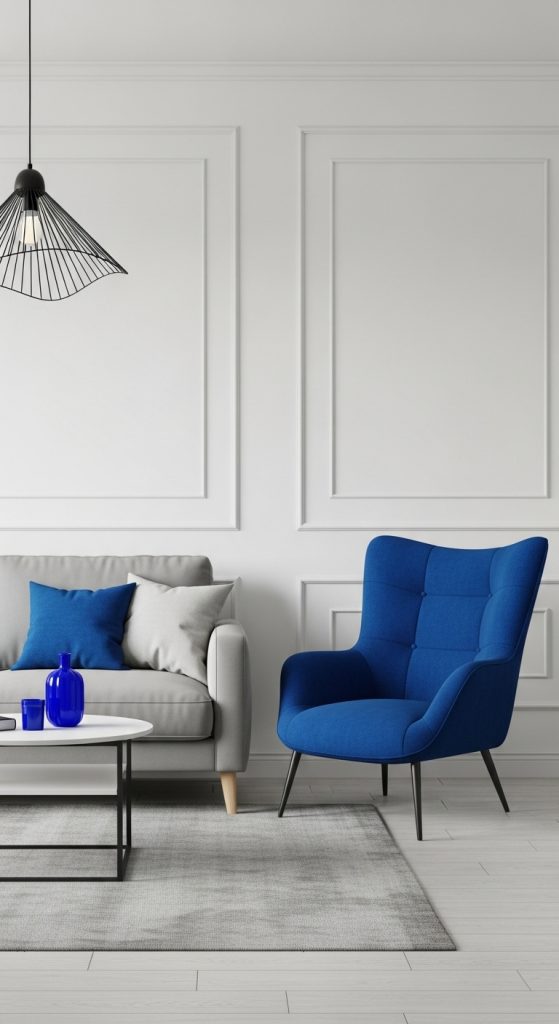 In an otherwise neutral room, a single, deliberate pop of color can have a massive impact. A bold teal armchair, a vibrant piece of decor on a shelf, or a collection of bright blue pillows can energize the entire space without disrupting its serene modern aesthetic.