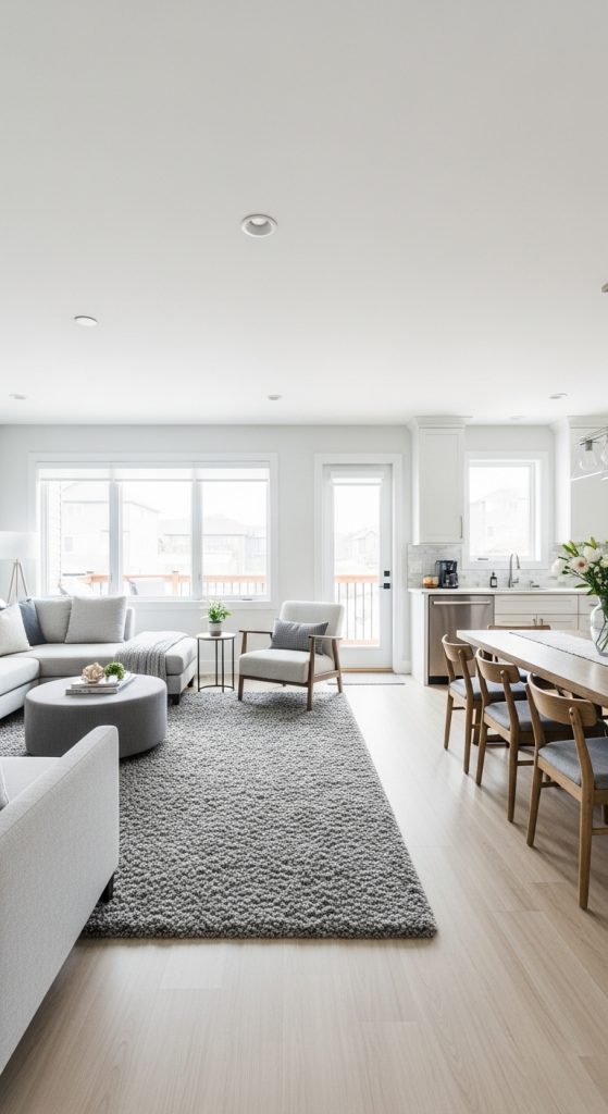 Modern living often embraces open-plan spaces. Use large area rugs to define the living room zone, and ensure a cohesive flow by using a consistent color palette and material choices across the living, dining, and kitchen areas.