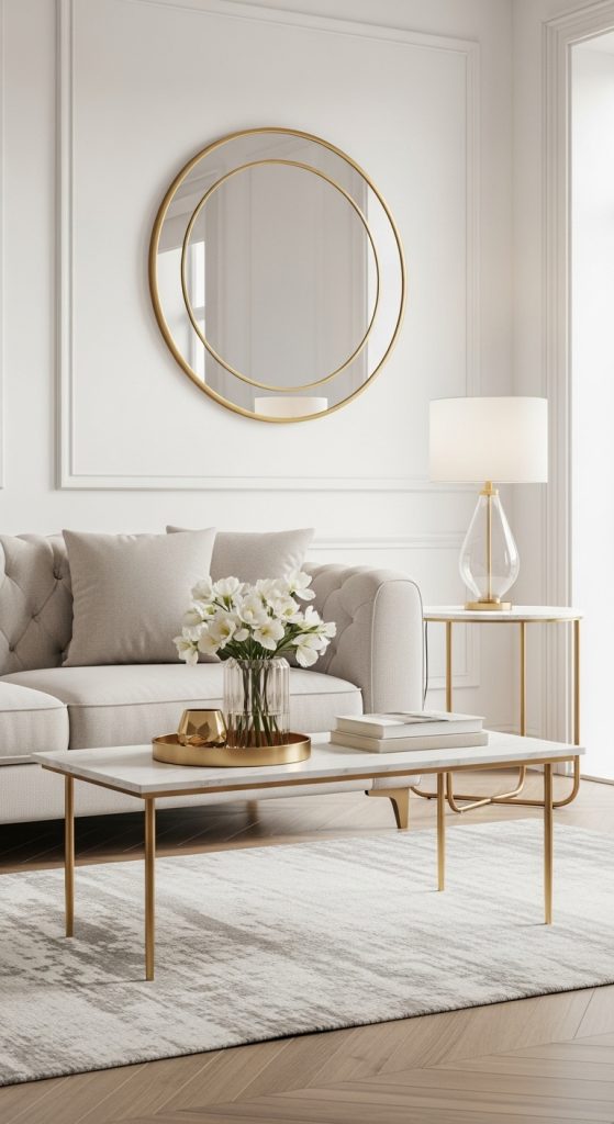 Metallic accents add a touch of glamour and light. Use gold, brass, or bronze finishes in small, strategic doses—on the legs of a chair, the frame of a mirror, a table lamp, or drawer pulls. This subtle touch elevates the space without being overpowering.