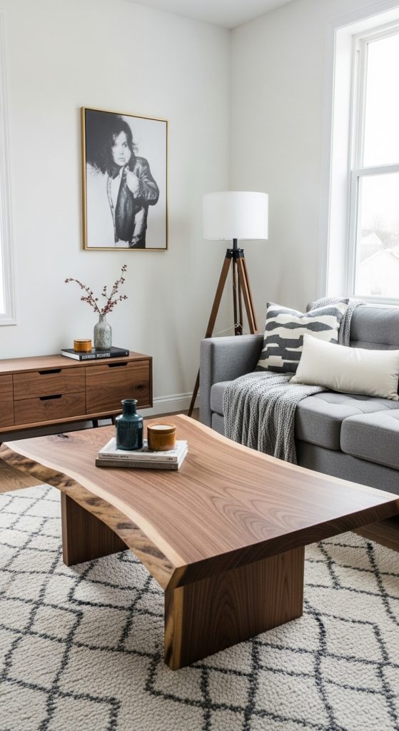 Introduce a piece of live-edge wood to celebrate nature's imperfections. A coffee table or console with its natural, uncut edge brings a raw, organic element into a clean, modern space, creating a beautiful focal point and conversation starter.